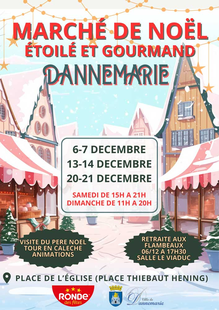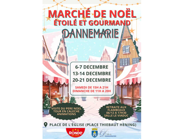 Der Weihnachtsmarkt ist am Samstag und Sonntag, dem 6., 7., 13., 14., 20. und 21. Dezember 2025, auf dem Place Thiébaut Hening (Kirchplatz) in Dannemarie geöffnet.