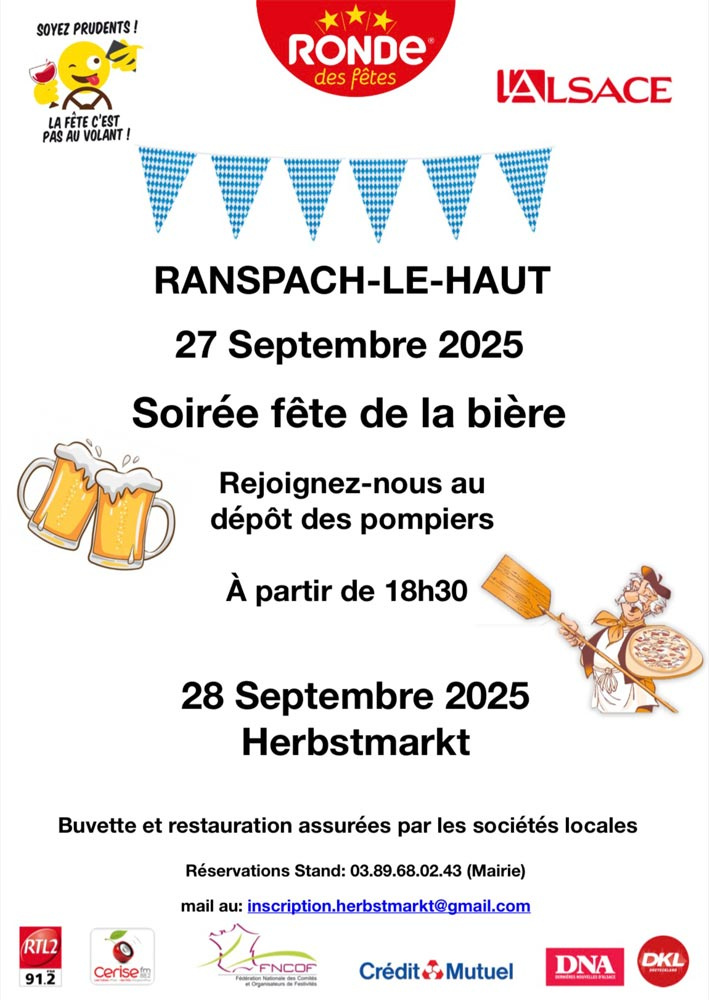 Die Feuerwehr von Ranspach-le-Haut Knoeringue lädt Sie, mit Unterstützung lokaler Vereine, zu einem festlichen Wochenende am 26. und 27. September 2026 in Ranspach-le-Haut ein.