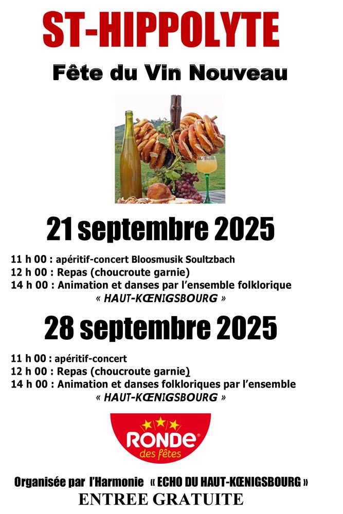 Vous pourrez y déguster du vin nouveau, savourer le repas du vendangeur, profiter des animations musicales et folkloriques (à partir de 14h), assurées par l'ensemble folklorique Haut-Koenigsbourg de Sélestat, et des animations variées avec la participation de Pascal Lacom et son accordéon.