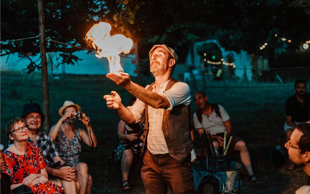 - 21h30 : Jongle de feu par la compagnie Art’Themis, sur la place centrale