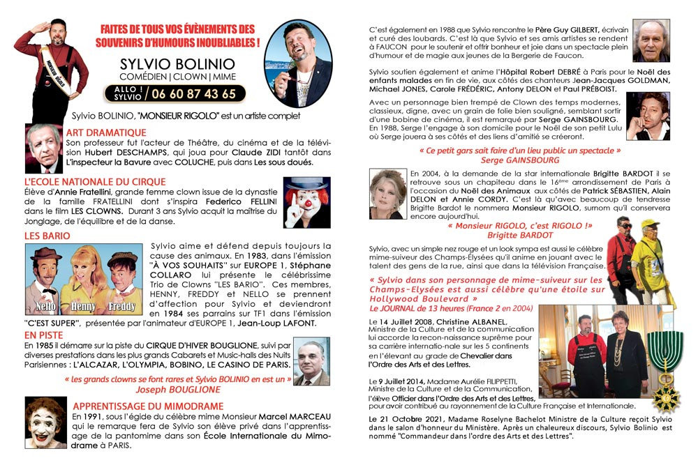 Sylvio Bolinio anime et se déplace dans toute la France et à l'étranger, l'artiste ayant une renommée internationale de part ses voyages et déplacements